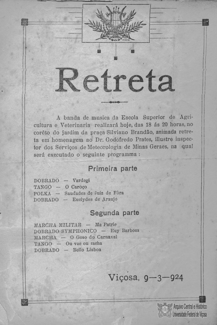 Convite impresso para uma retreta da Banda de Música da ESAV, em Viçosa, em homenagem ao Dr. Godofredo Prates então inspetor dos serviços de meteorologia de Minas Gerais.