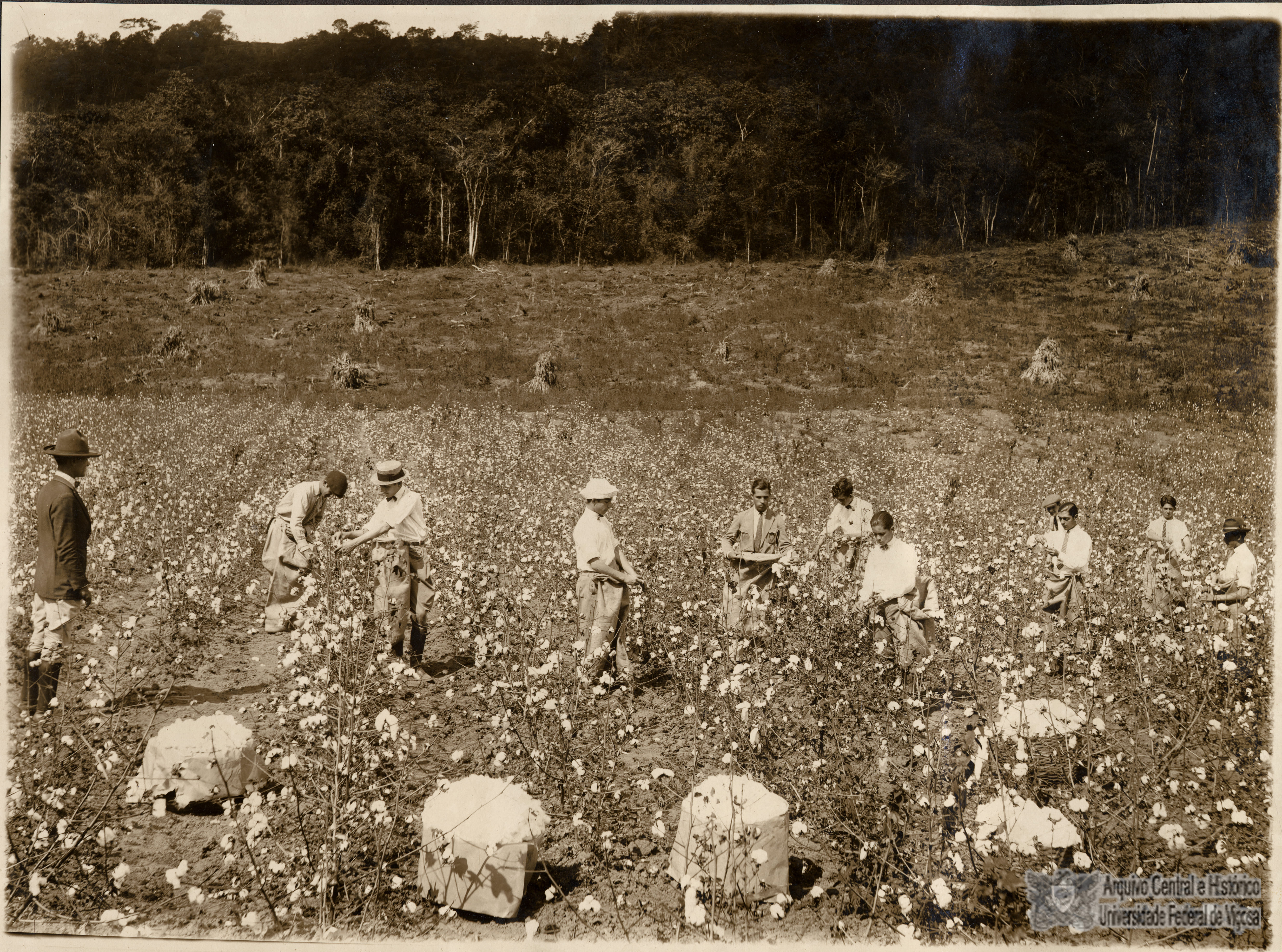 Colheita de algodão realizada pelos alunos, supervisionados pelo professor Diogo Alves de Melo. Na oportunidade eles aprendem o método próprio de selecionar algodão.