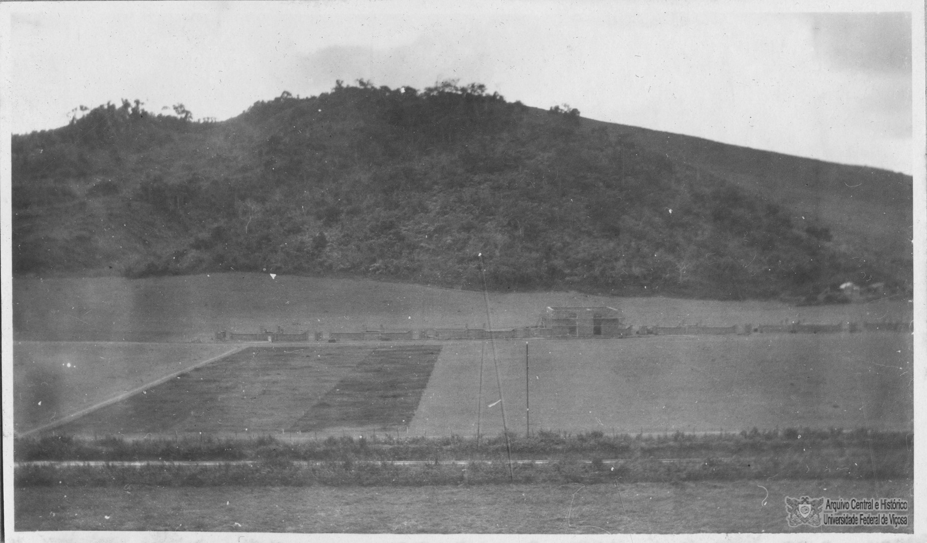 Vista da área central do Campus da ESAV. Em primeiro plano os trilhos da Leopoldina Railway. Ao fundo a construção das pocilgas e depósito de alimentos. Do oeste para leste Horta e Campo de Cultura.