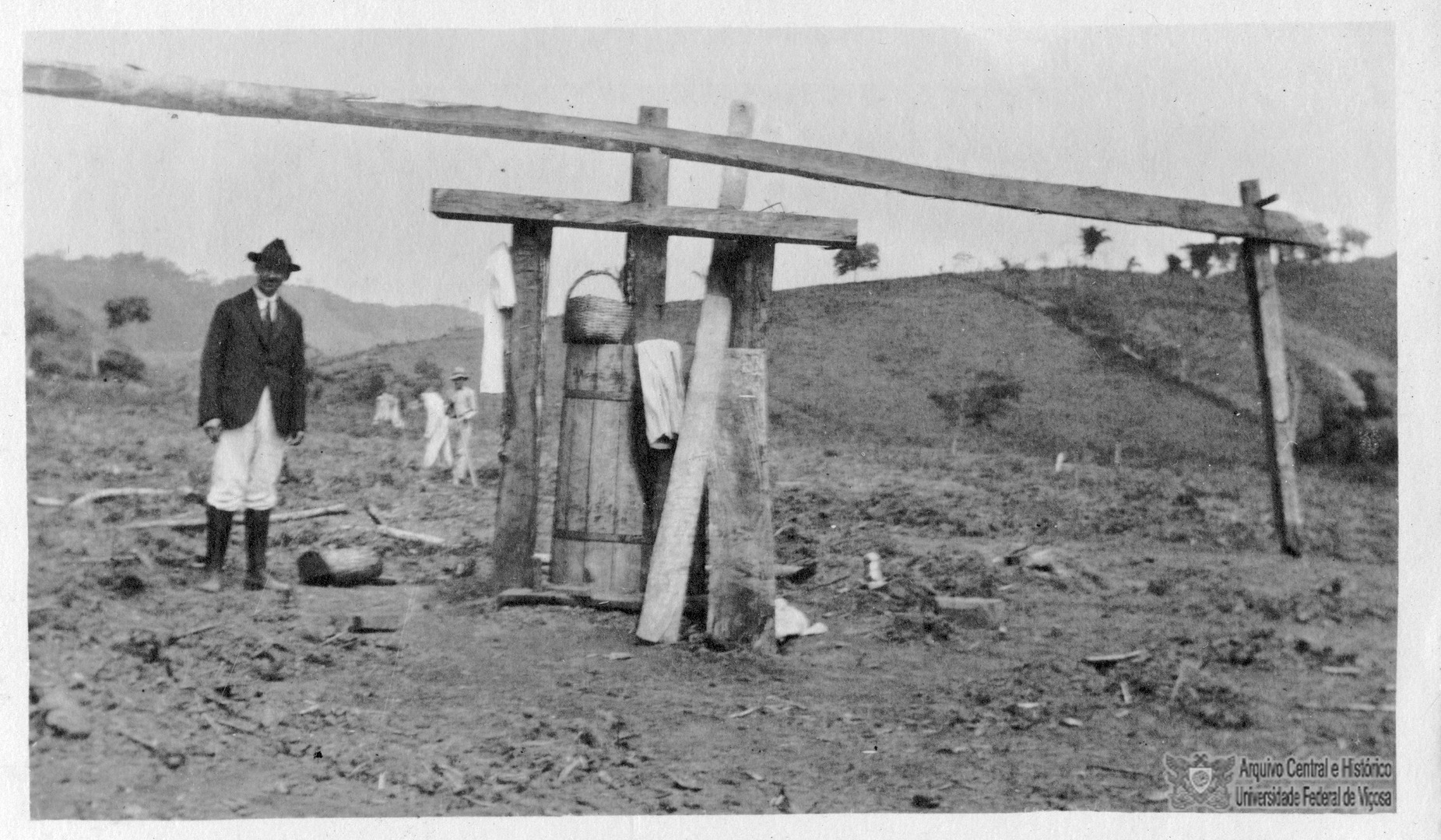 Pessoa desconhecida ao lado do moinho usado na fabricação de tijolos à base de barro.