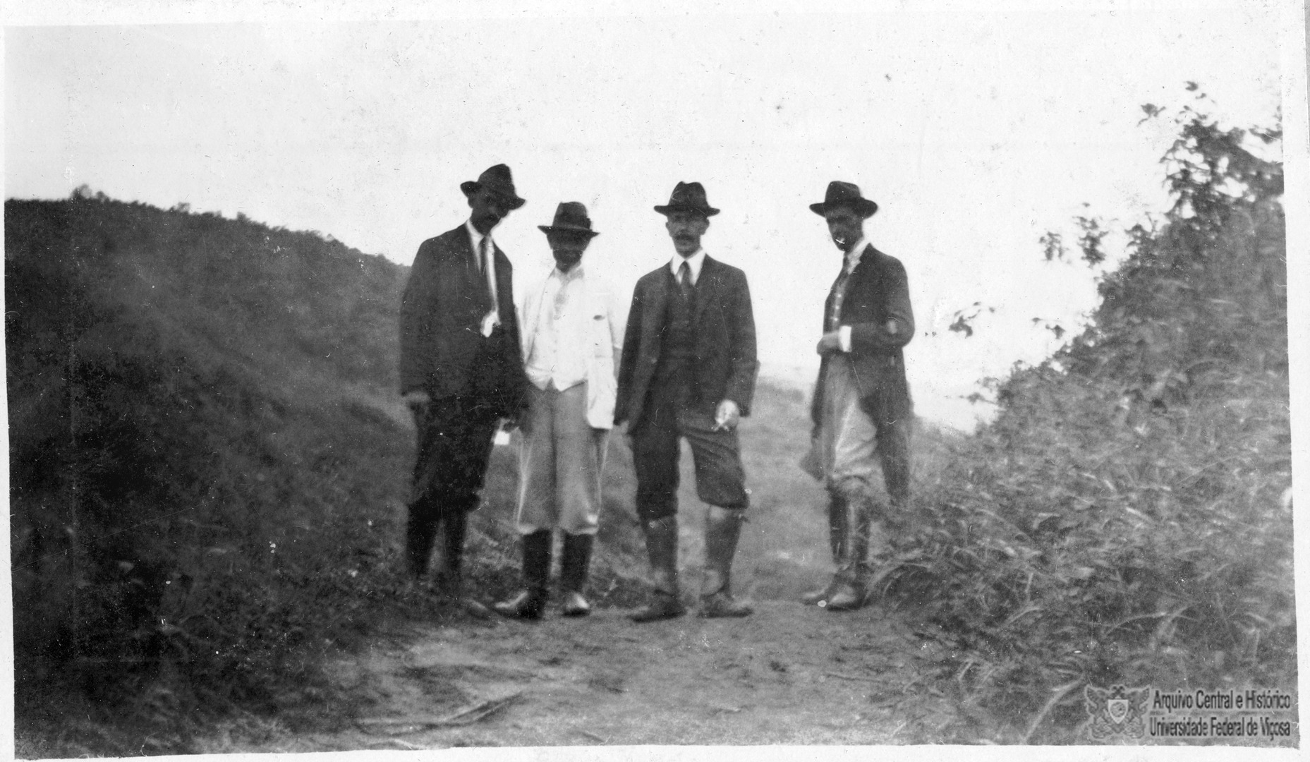 Engenheiros e encarregados da construção da ESAV próximos da fonte da Água Potável. Da direita para a esquerda, Mário das Neves Machado, Secretário da Construção e Engenheiro; Honório Hermeto da Costa Corrêa, Engenheiro Chefe; Ernesto Jovinini, Capataz da Construção; Cornélio Siqueira, Capataz dos Materiais de Construção; Ernesto Jovinini, Capataz da Construção; e Cornélio Siqueira, Capataz dos Materiais de Construção.