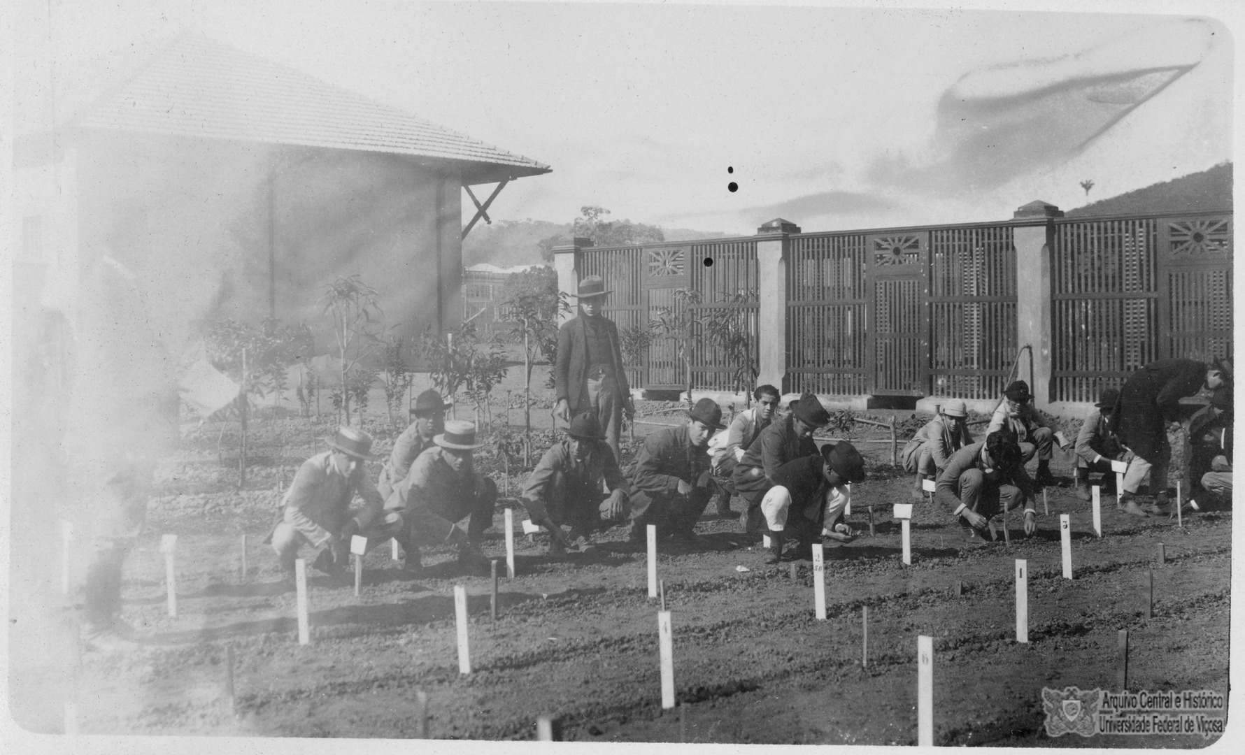Professor observando os alunos em uma aula de curso prático na horticultura.