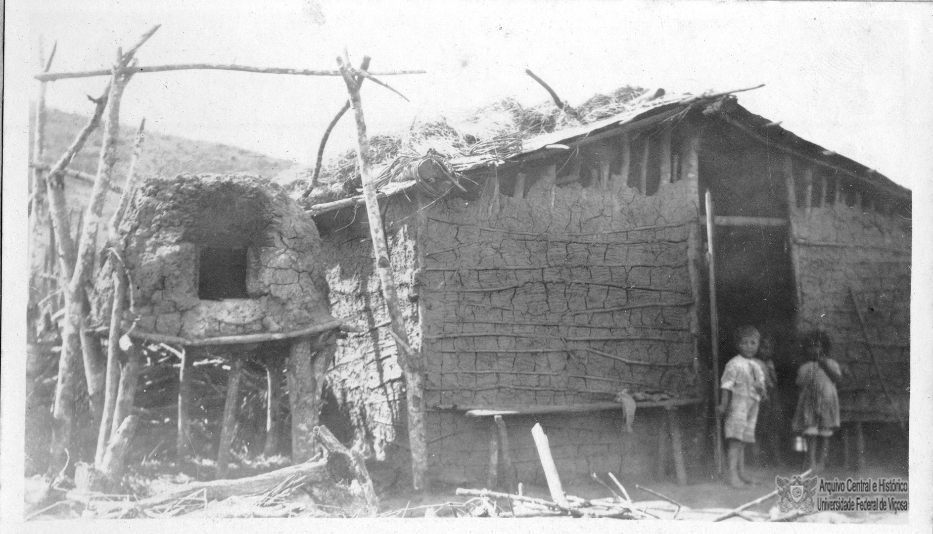 Crianças na porta da residência de operário empregado na construção do Prédio Principal. As casas eram simples, de pau a pique. Ao lado há um forno a lenha, utilizado para o preparo de quitandas.