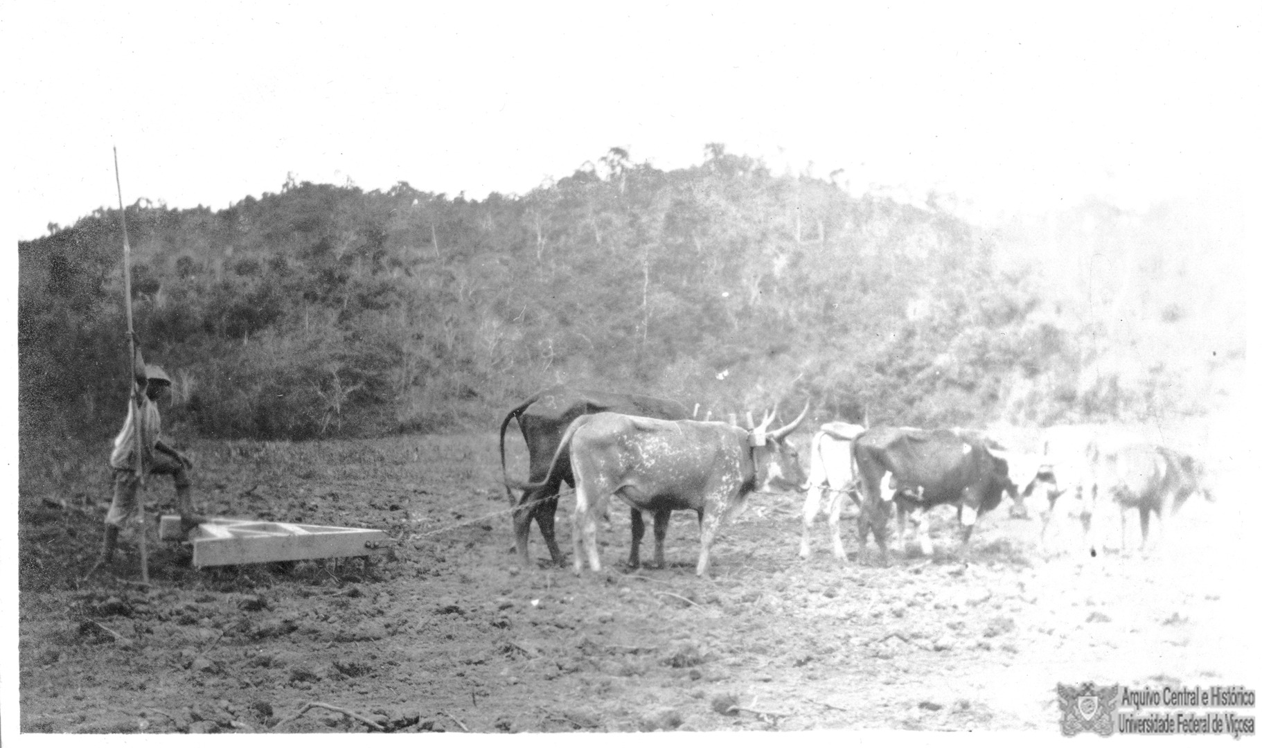 Operários guiando bois que puxavam um “triângulo” para o nivelamento do solo.